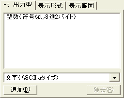出力の型を指定します。複数の型を指定することができます。複数の型を指定した場合には、同じデータについて型の数だけ行を出力し、次の部分に進みます。指定できる型は、次の通りです。