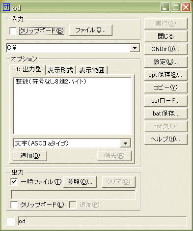 このフロントエンドからは、-sオプションを指定しないodプログラムを実行して、指定されたファイルを指定された形式で表示することができます。odプログラムは、-sオプションを指定するか否かによって、大きく異なる動作をします。そこで、2つの異なる機能のために2種類のGUIフロントエンドを用意しました。もう1つのGUIフロントエンドは、字(odstrfe.exe)です。PCK版のodは、-sオプション関連以外では、cygwin版に対して、-tオプションの出力型としてSJIS(-taK、-tcK)、Unicode(-taU、-tcU)、big-endianの整数型(R)を追加し、long double型(-tfL)を取り除いたものになっています。このフロントエンドの「実行」ボタンは、何らかの入力が指定されたときに有効になります。